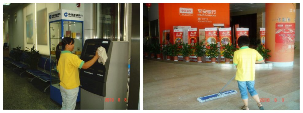 其中本公司为厦门建行连续提供网点勤杂(日常保洁);室外门楣、门面保洁;离行式ATM机;离行式自助银行等保洁服务已有14年,为厦门工行连续提供各网点门楣招牌、离行式自助银行及离行式ATM机等各项定期保洁服务有10年的合作经验,为中国银行厦门市分行提供各网点门楣招牌、离行式自助银行及离行式ATM机等各项定期保洁服务有3年的合作经验。厦门邮政储蓄银行离行式ATM机定期保洁服务有3年的合作经验,在长期服务合作中,我公司根据网点的实际情况及具体要求提供良好的服务,积极配合、响应客户的各项应急服务需求,对在服务中出现的问题及时与负责人沟通并有效解决。